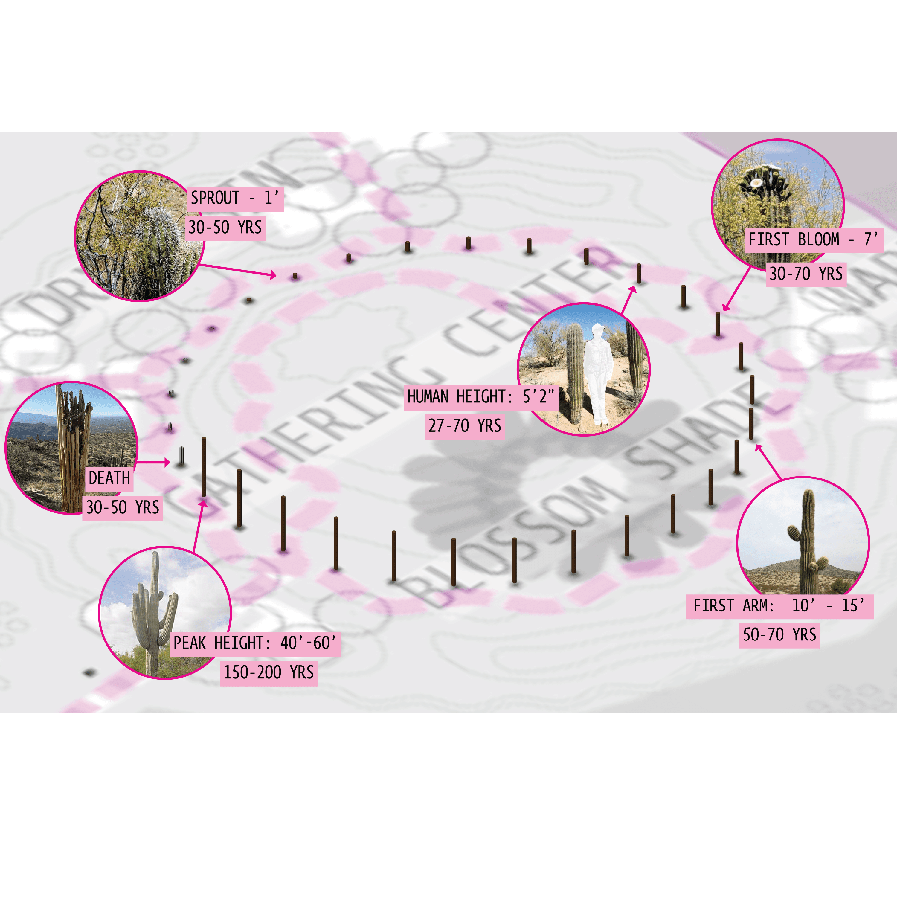 Tucson will get warmer, and we have only a few chances each year to capture rainwater. This project learns from the saguaro, which has adapted to the semi-tropical climate of the Sonoran Desert by transforming the landscape into a seasonal refuge from the heat, aligning with the new year traditions of its first occupants: the Tohono O’odham people. The site must have a strong foundation to withstand future climate and cultural shifts while accommodating user needs, informed by the latest master plan and community engagement findings.